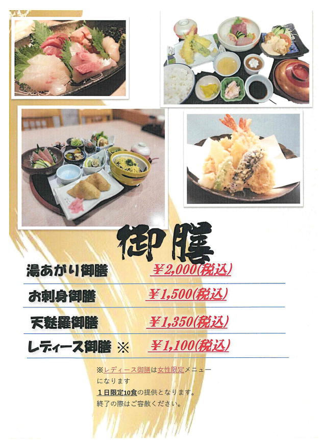 朝食 1,000円(税込)~ 夕食 3,000円(税込)~